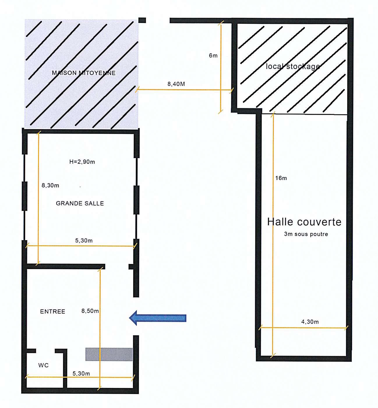 - Une entrée (45m²) avec coin cuisine (point d'eau, frigo, congélateur, placards), un wc